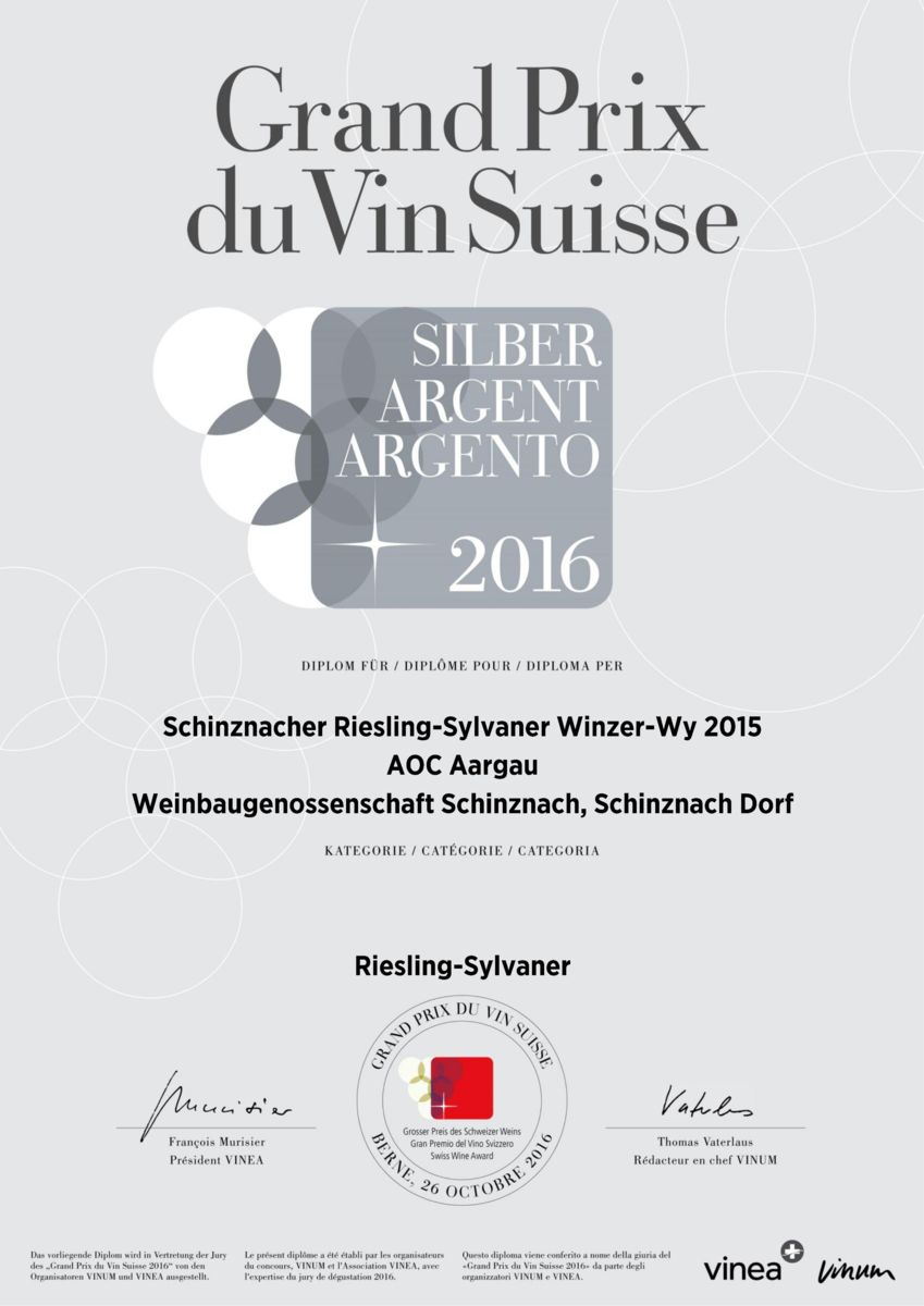 Silbermedaille Grand Prix du Vins Suisse, Schinznacher Riesling-Silvaner, Winzer Wy, 2015