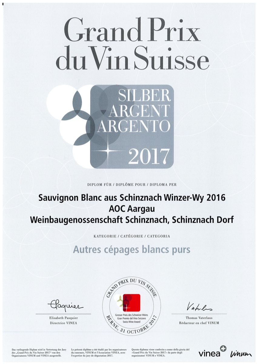 Silbermedaille Grand Prix du Vins Suisse, Schinznacher Sauvignon Blanc Winzer Wy, 2016 |