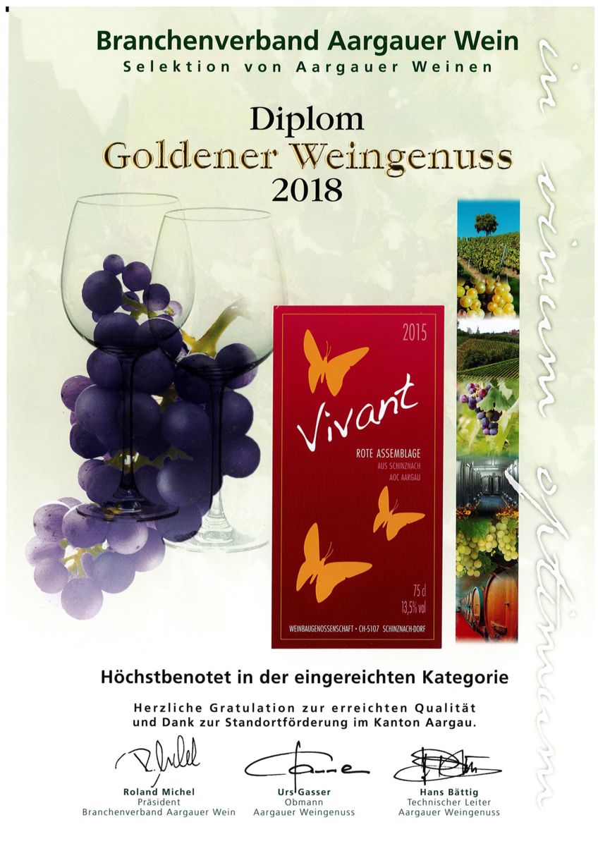 Goldener Weingenuss Höchstbenotung Branchenverband Aargauer Weine, Vivant, rote Assemblage aus Schinznach, 2015