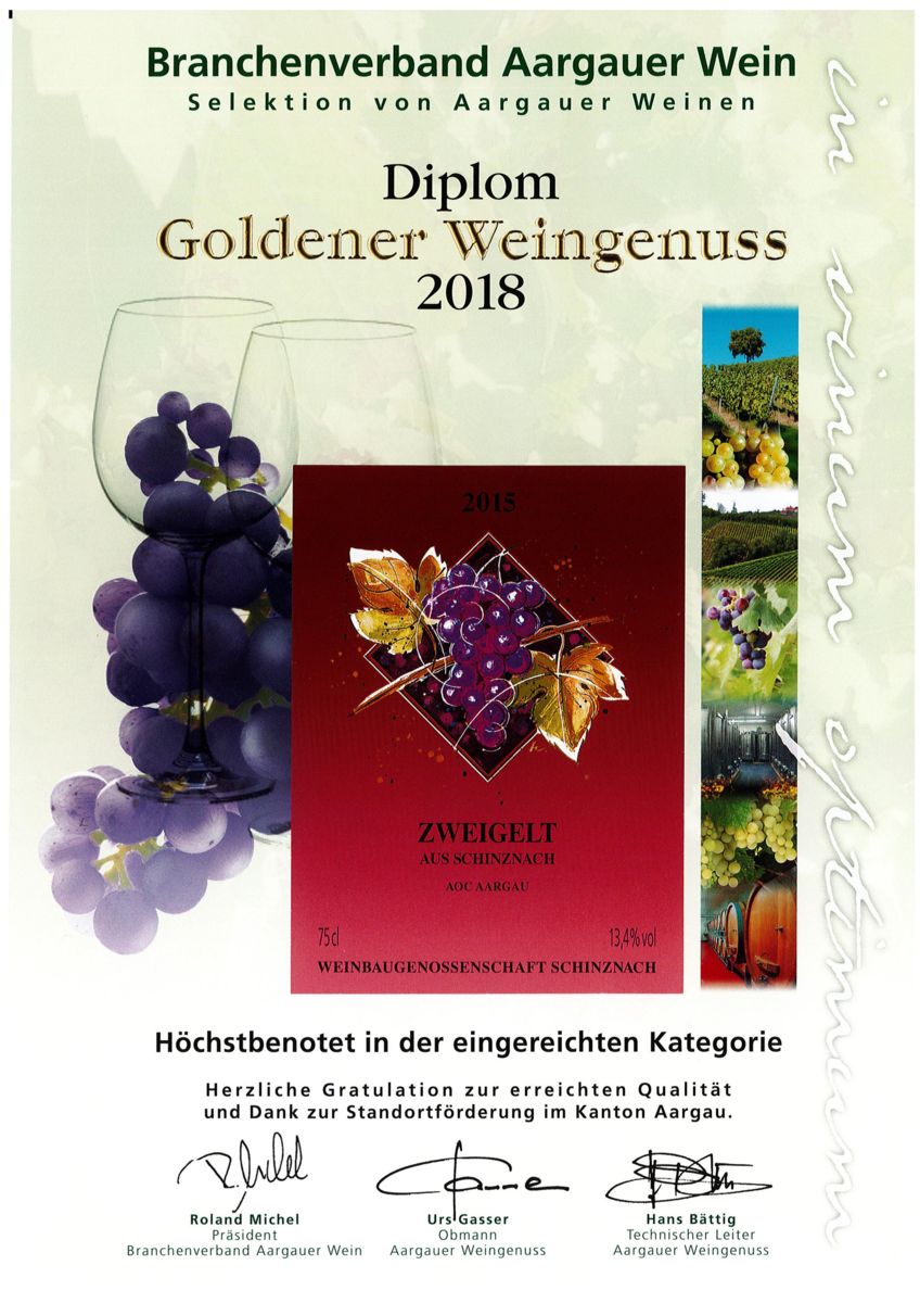 Goldener Weingenuss Höchstbenotung Branchenverband Aargauer Weine, Zweigelt aus Schinznach, 2015