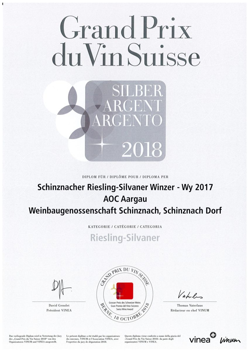 Silbermedaille Grand Prix du Vins Suisse, Schinznacher Riesling-Silvaner Winzer Wy, 2017